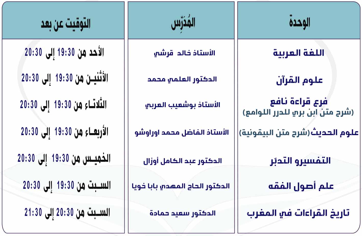 القراءات, سيبدأ التكوين يوم "الثلاثاء 22/09/2020 م -الموافق ل1442/2/4ه"و ذلك حسب البرنامج التالي :